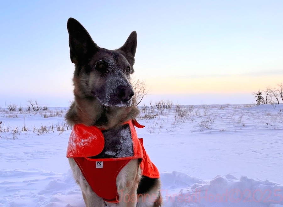 Molly having fun in the cold this morning.Maggie and GingerSnap! were startled by the dog barking.